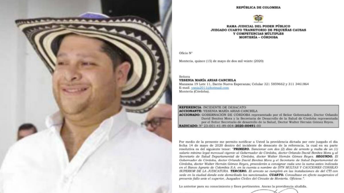 En su decisión el togado señala que 'se sanciona por dos días de arresto y una multa de un salario mínimo legal mensual vigente, al gobernador de Córdoba, Orlando David Benítez Mora y al secretario de Salud, Walter Gómez Reyes'.