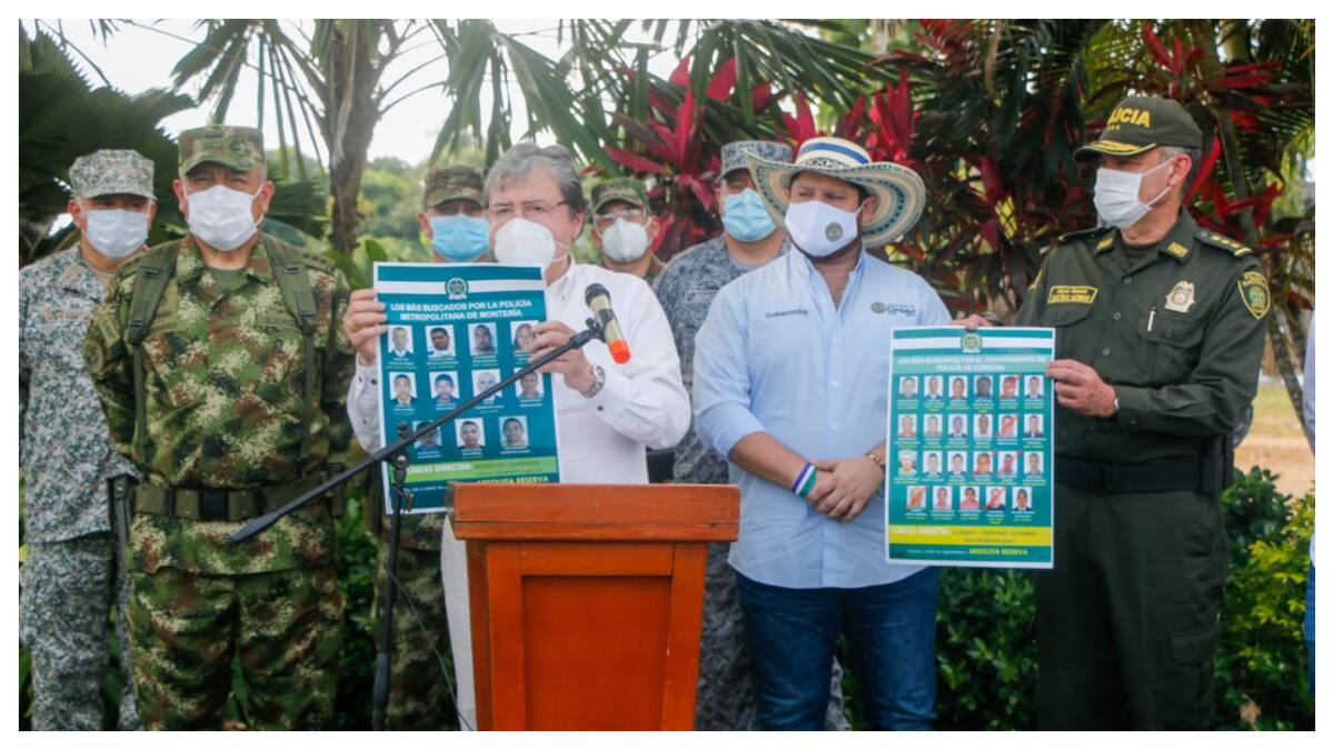 'En el cartel de los más buscados figuran alias ‘Mano de Trinche’, ‘Carbonero’, ‘Conchilla’, ‘la Mona’, ‘Palomo’, entre otros personajes, por eso le rogamos a la ciudadanía que contribuya con sus informaciones a dar con el paradero de estos delincuentes y la captura será fundamental para mejorar las condiciones de seguridad en montería', indicó el Ministro de Defensa.