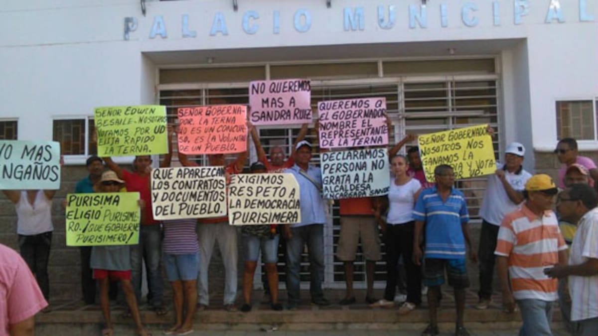 En enfrentamientos con un grupo de agentes del Escuadrón Móvil Antidisturbios (Esmad) terminó una protesta de ciudadanos en la mañana de este miércoles, en Purísima, quienes habían atrancado la puerta de la Alcaldía con el fin de prohibir el acceso de la mandataria encargada, Sandra Ruiz y de los demás funcionarios.