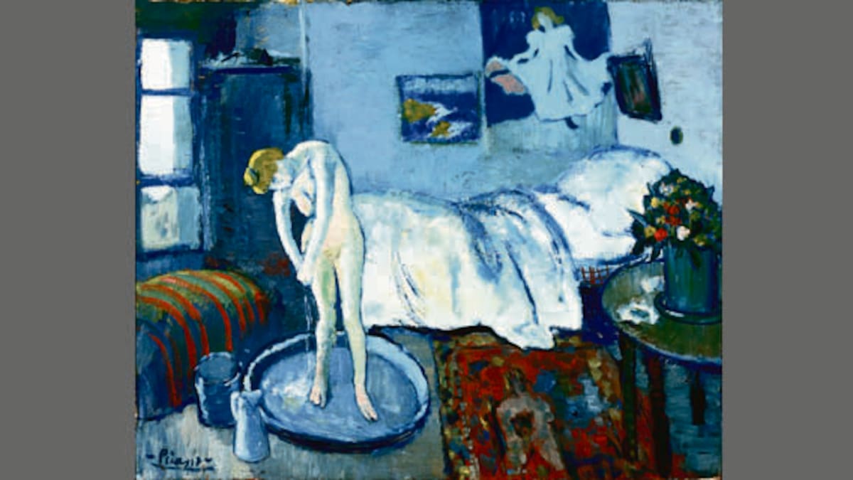 La habitación azul (arriba) es el cuadro pintado por Pablo Picasso en el que investigadores estadounidenses descubrieron, a través de rayos X y un escáner hiperespectral, el retrato de un hombre (abajo) vestido con chaqueta y pajarita, con barba, el cuerpo inclinado hacia la derecha y con la cabeza apoyada sobre su mano derecha. Efe