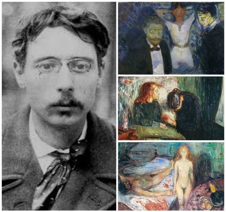 Munch fue un niño enfermizo, aquejado de continuos catarros, asma, fiebres reumáticas y tuberculosis. Fue de anatomía débil y sensibilidad excesiva. Desde pequeño estuvo aterrorizado. Se despertaba en las noches creyendo que le podría pasar algo, incluido irse al infierno. Su padre, médico forense, era religioso en extremo. Según explicaría el propio Munch, rayano en la locura. Y todo ese abultado fervor religioso que el padre volcaba en el hogar le exacerbaba la imaginación y su estado emocional. Siempre fue huidizo. Las aglomeraciones de gentes las pintó como masas angustiadas, envueltas en torbellinos de pinceladas ondulantes con las que pareció querer distinguir las ansiedades de la vida diaria. Personajes que pintó de cara al espectador, quizás no solo esperando un efecto espejo, sino para buscar él mismo una comunicación con toda esa gente con la que le era difícil comunicar. Fue un hombre coqueto que tuvo muchas amantes a lo largo de su vida. Milly Thaulow, la primera, era una mujer casada mayor que él, que lo hacía sufrir mostrándose con sus otros amantes. A esta le siguió Tulla Larsen, una rica heredera posesiva que quería casarse con él a toda costa. La relación entre ambos terminó en fuerte disputa y con un dedo de Munch dañado para siempre. En una discusión con ella, el arma que él llevaba en la mano se le disparó accidentalmente y le mutiló el dedo corazón de la mano izquierda. De este último, salió el cuadro La muerte de Marat. Para representar la melancolía de un celoso, sin embargo, se valió de la figura de su gran amigo Jappe Nielsen, otro al que también le habían puesto los cuernos. Y para el personaje del hombre abatido por los celos, que tituló Celos –también hizo varias versiones de este sentimiento– se valió de su amigo Stanczu, con el que compartió en trío a otra de sus amantes: Dagny Juel. Y en el cuadro los representó a ellos tres.