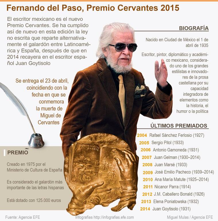 El escritor Fernando del Paso fue galardonado hoy con el Premio Cervantes 2015, el máximo galardón de las letras en castellano, por la 'valentía en la creación y su arriesgada innovación', según el fallo del jurado del premio, dotado con 125.000 euros (unos 134.000 dólares).