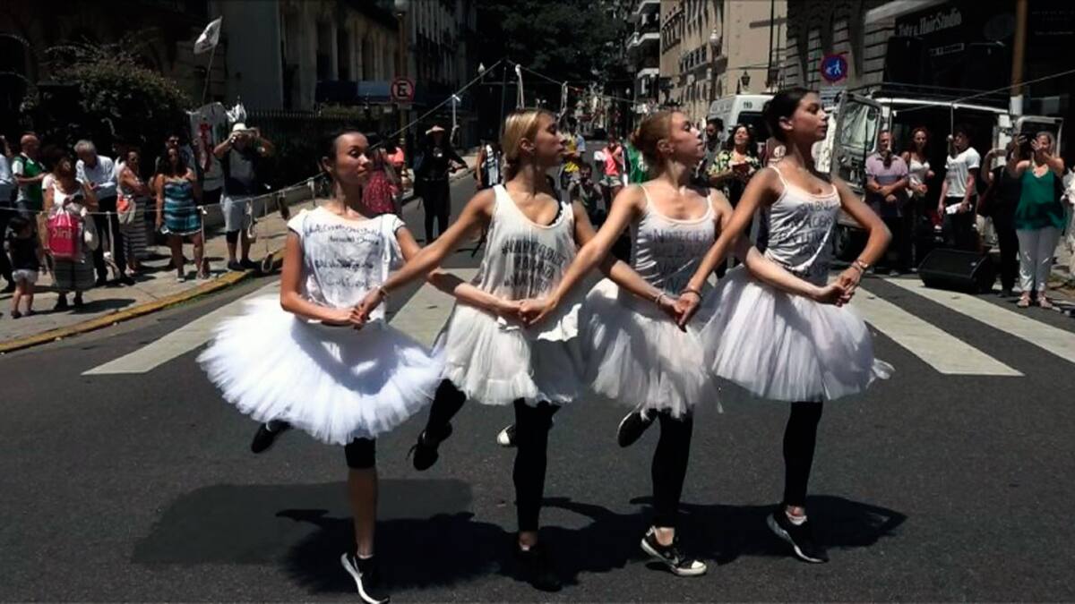 En pleno centro de Buenos Aires, decenas de bailarines dieron una clase abierta de ballet clásico para protestar por el cierre de su compañía Danza por la inclusión, que este año quedó fuera del presupuesto del ministerio de Cultura.
