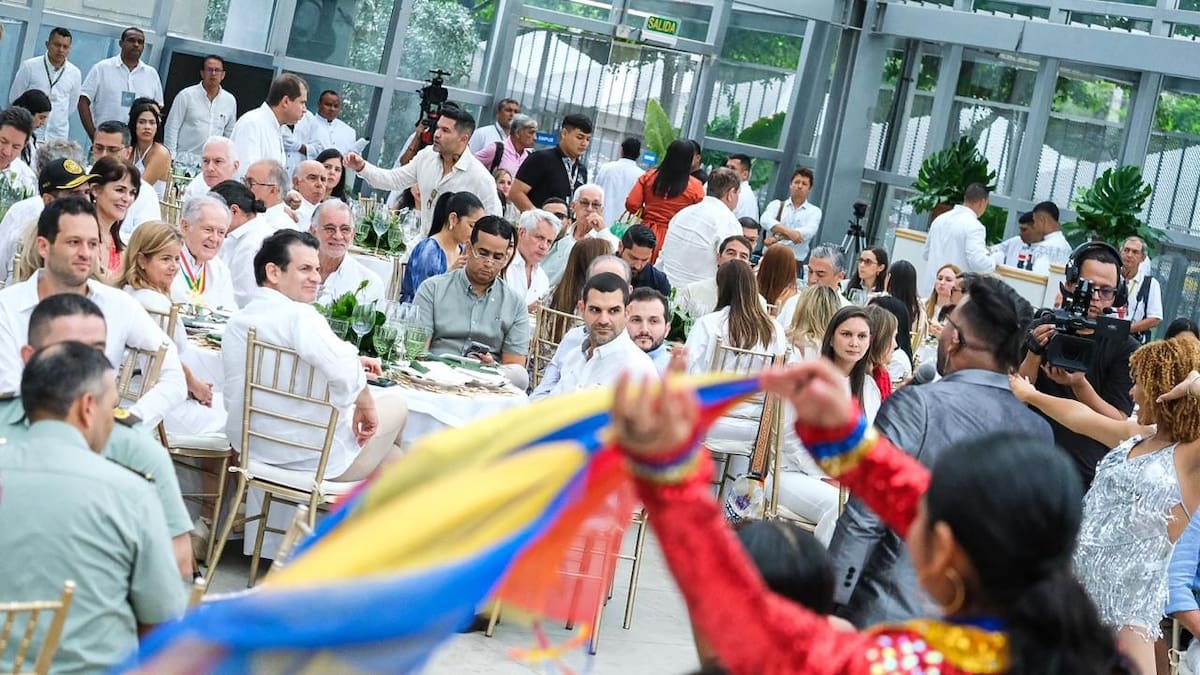 El show inició con “Cumbia flamenca”, después “Colombia tierra querida” que dice en su letra: ‘Tu suelo es una oración y es un canto de la vida’, lo que arrancó los aplausos de los asistentes, en especial a los de la mesa principal, los familiares del señor Sarmiento Angulo, luego vino “Décimas”, “Manguito biche”, un show de caja y guacharaca, un mix de Celia Cruz, el bambuco “Soy colombiano” que también avivó, con mayor fuerza, los aplausos del público y finalmente hubo un remate muy emotivo cuando un niño que no supera los 8 años, a quien el gobernador le había entregado una acordeón en días pasados, con su interpretación se le brindó un homenaje al recién fallecido cantautor Omar Geles con uno de sus éxitos “Los caminos de la vida”.