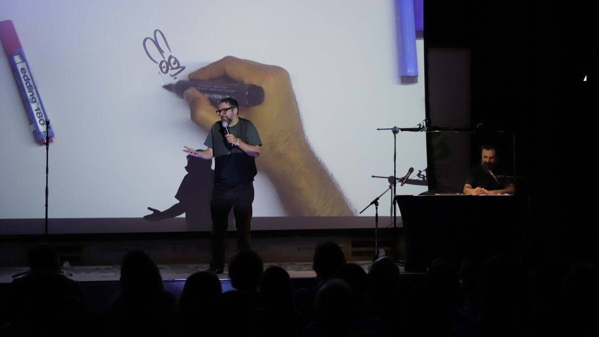 Juntos se unieron para crear en escena una dinámica y espontánea, donde uno contó sus historias, mientras el otro las caricaturizaba. Los dibujos se proyectaron sobre una gran pantalla para involucrar a todos en la creación de los personajes.