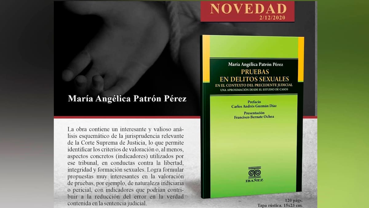 La abogada María Angélica Patrón Pérez, especialista en derecho penal y con un magister en la misma profesión, lanzó el pasado 2 de diciembre su primer libro titulado: Pruebas en delitos sexuales en el contexto del precedente judicial, una aproximación desde el estudio de casos, con el apoyo del Grupo Editorial Ibáñez.