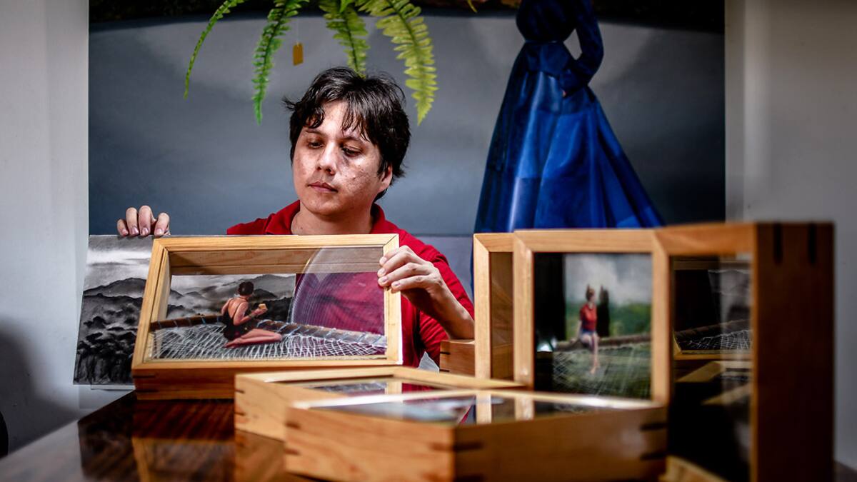 Son un total de 11 pinturas y 8 piezas de ensambles en las que paisajes del corregimiento de Minca, Santa Marta, descansan como fondo en cajas de madera. Estas, a su vez, son protegidas con un vidrio que lleva otra pintura, y juntas conforman una sola. (Ver imagen)