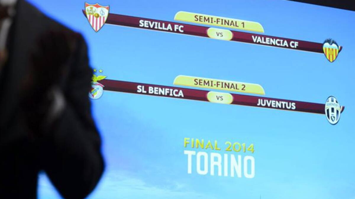Sevilla-Valencia y Benfica-Juventus de Turín serán los enfrentamientos de las semifinales de la Liga Europa, según el sorteo realizado hoy por la UEFA en su sede en Nyon (Suiza).