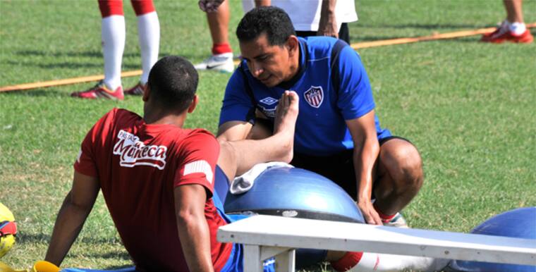 Iván Romero, fisioterapeuta del Junior, atiende al lesionado César Fawcett.