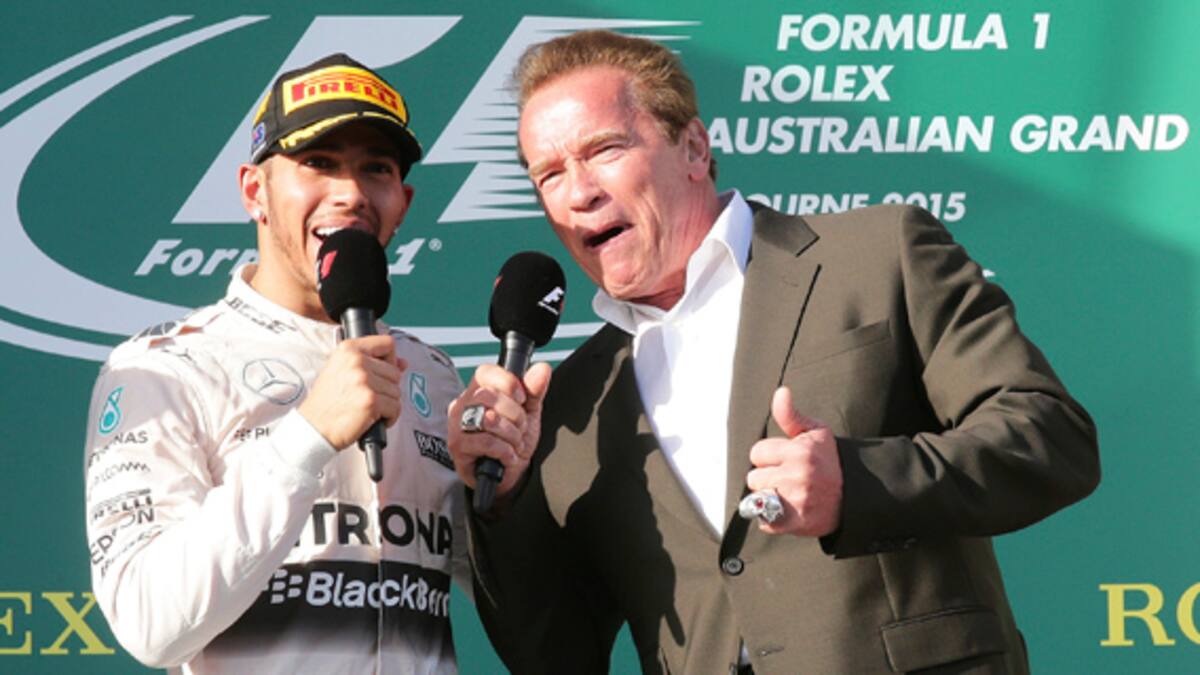 MELBOURNE, Australia. Desde lo más alto del podio de los ganadores en el Gran Premio de Australia, Lewis Hamilton y Arnold Schwarzenegger dijeron al unísono la frase que hizo famosa el actor: 'Volveré'.