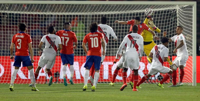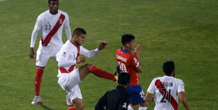 Chile adelantó sus líneas y obligó a replegar a los dirigidos por Ricardo Gareca, quienes a pesar de contar con un jugador menos, siguieron creando peligro por medio de su delantero Paolo Guerrero.