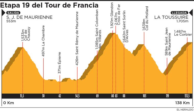 La Toussure, la meta de hoy. En 138 kilómetros, la penúltima etapa alpina, con salida en Saint-Jean-de-Maurienne, concentra un puerto de categoría especial, la Croix de Fer, y dos de primera, el último de ellos, La Toussuire, en la meta de la jornada.