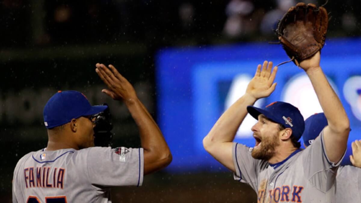 El segunda base Daniel Murphy se mantuvo explosivo con su bate y pegó jonrón por quinto partido de la fase final con el que ayudó a los Mets de Nueva York a conseguir un triunfo por 5-2 sobre los Cachorros de Chicago y dejándolos a una victoria de lograr el pasaporte a la Serie Mundial por primera vez desde la temporada del 2000.