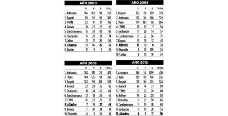 En los Juegos Nacionales de 2012 Atlántico ocupó una undécima plaza (8 de oro, 5 de plata y 17 de bronce, 30 en total) que reflejó más que el bajo desempeño de los deportistas, el abandono gubernamental hacia el deporte del Departamento. Córdoba, Risaralda y Boyacá, este último con creces (34 oros), superaron al Atlántico en la peor edición de sus últimas cuatro presentaciones, aunque ‘lo mejor’ ha sido el octavo lugar.