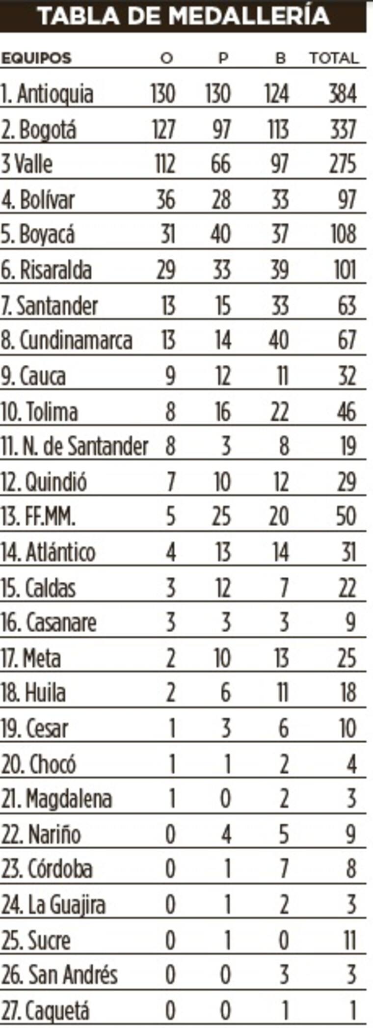 En estas justas realizadas a lo ‘de todito’, porque se disputaron en cinco sedes (Tolima, Valle del Cauca, Chocó, Cundinamarca y Antioquia) solo el boxeo y el tenis de campo femenino pudieron arañarle algo a las potencias del país: Antioquia, Bogotá y Valle.