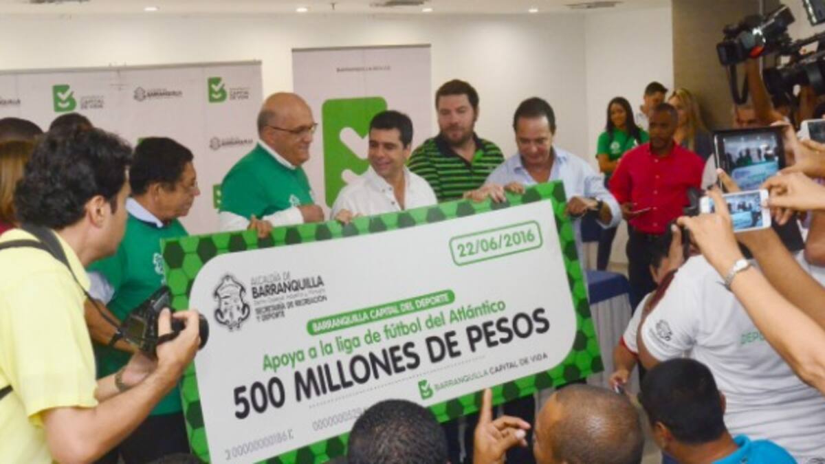 Una inyección económica de 500 millones de pesos le otorgó ayer el alcalde de Barranquilla, Alejandro Char, a la Liga de Fútbol del Atlántico. El acto se oficializó en el hotel Barranquilla Plaza, en donde estuvo Moisés Díaz Velásquez, presidente de la Liga de fútbol y Joao Herrera, Secretario Distrital de Recreación y Deportes.