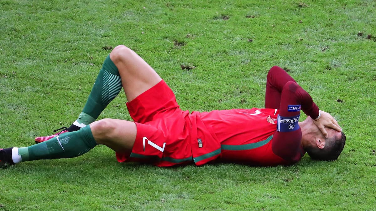 El capitán recibió dos duras entradas del francés Dimitri Payet, en los minutos 8 y 16, fue atendido en ambas ocasiones en la banda, pero regresó cojeando y poco después pidió el cambio, tiró el brazalete al césped y abandonó en camilla y llorando el terreno de juego, el capitán fue sustituido por Ricardo Quaresma.