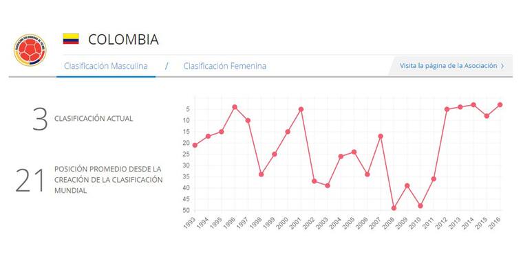 La selección Colombia de Fútbol se mantiene en el tercer puesto de la clasificación mundial de la FiFA con 1.331 puntos, por debajo de la líder Argentina con 1.585 puntos y Bélgica con 1.401, después de un mes de escaso fútbol, que ha provocado que no haya cambios entre los veinte primeros puestos.