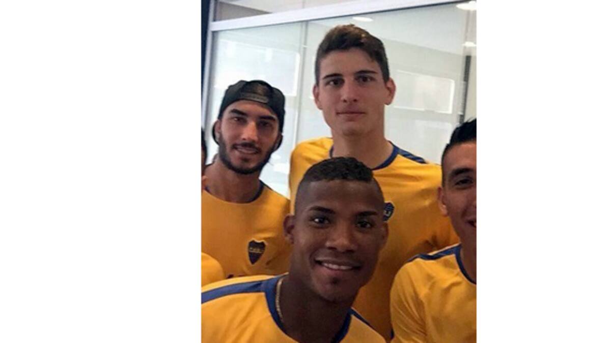 Los dos volantes de primera línea posaron con la camiseta de su nuevo club, junto a Solis, Werner, Centurión, Vergini, los otros refuerzos que llegaron a Boca para esta temporada.
