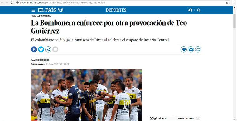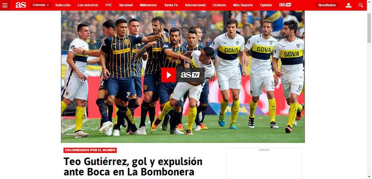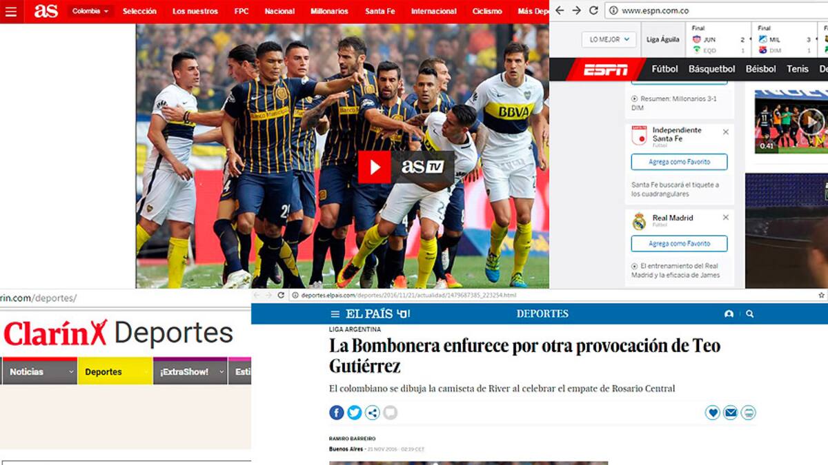 AS tituló 'Teo Gutiérrez, gol y expulsión ante Boca en La Bombonera'. Mientras que El Pais rotuló 'La Bombonera enfurece por otra provocación de Teo Gutiérrez'.