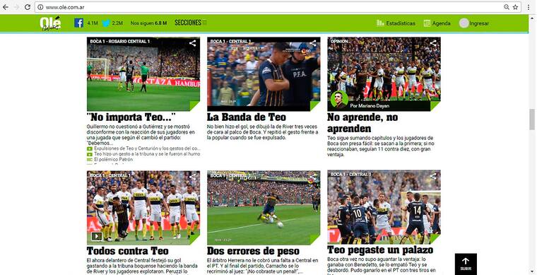 El diario Olé de Argentina, en su primera tituló 'todos contra Teo' y 'CacheTeo', haciendo referencia al desarrollo del partido.