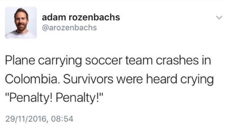 Luego de conocerse el lamentable accidente que sufrió el equipo Chapecoense cuando se trasladaba a Medellín, el comediante australiano Adam Rozenbach hizo un comentario de burla en su cuenta de Twitter sobre el siniestro.