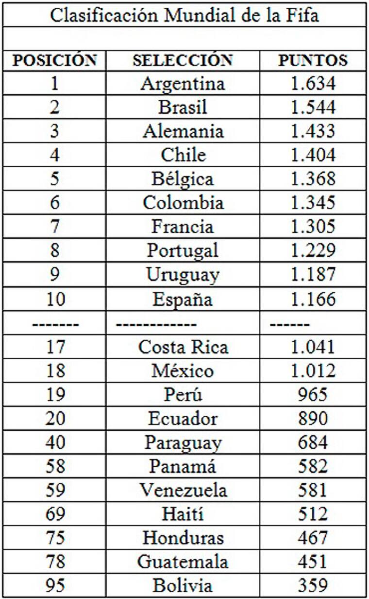 Argentina, Brasil y Alemania encabezan la clasificación mundial de la FIFA, que se mantiene sin cambios entre los 34 primeros equipos.