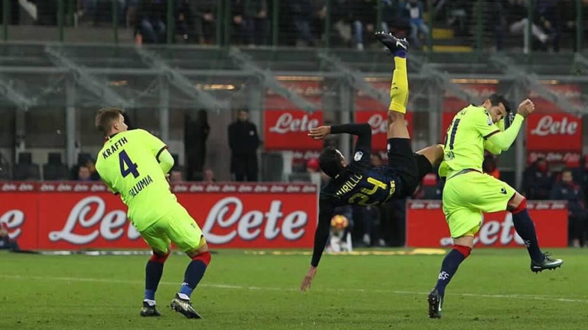El defensa colombiano Jeison Murillo anotó un espectacular gol de chilena en el partido que el Inter de Milán le ganó 3-2 al Bologna, en el estadio Giuseppe Meazza, en el partido de vuelta de los octavos de final de la Copa de Italia.