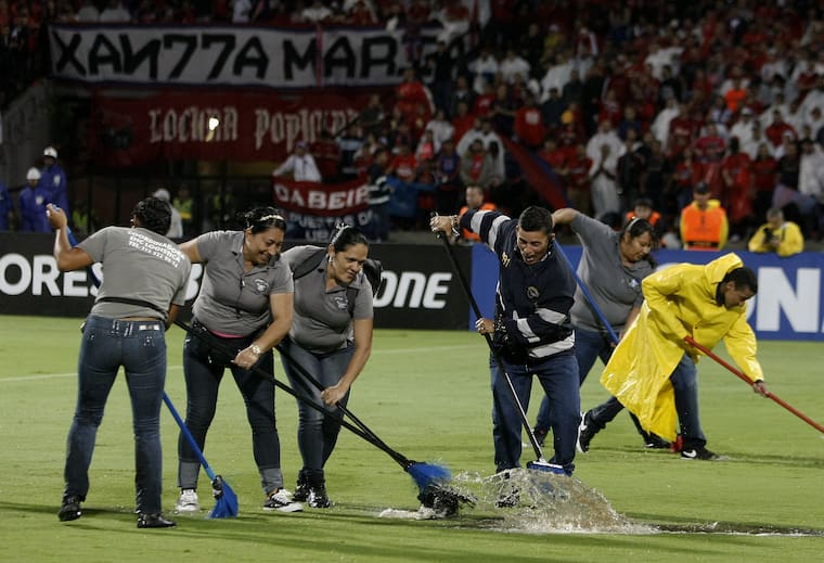 El encuentro, que fue suspendido por más de media hora cuando promediaba el primer tiempo, se disputó en medio de una piscina producto de la fuerte lluvia que cayó la tarde y parte de la noche en la ciudad de Medellín (noroeste).