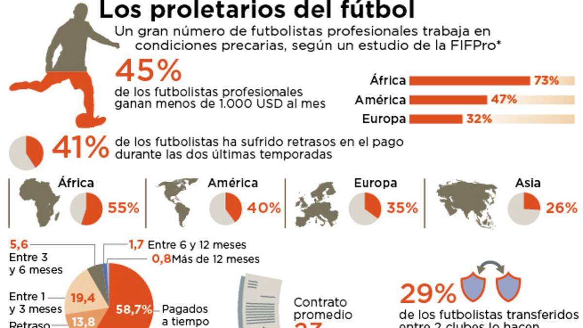 La organización reveló en un extenso estudio sobre este tema a finales de noviembre, con el testimonio de 14.000 jugadores en 54 países, que el 41% de los futbolistas no reciben sus salarios a tiempo, y que el 45% de los profesionales ganan menos de 1.000 dólares mensuales, unos 945 euros.