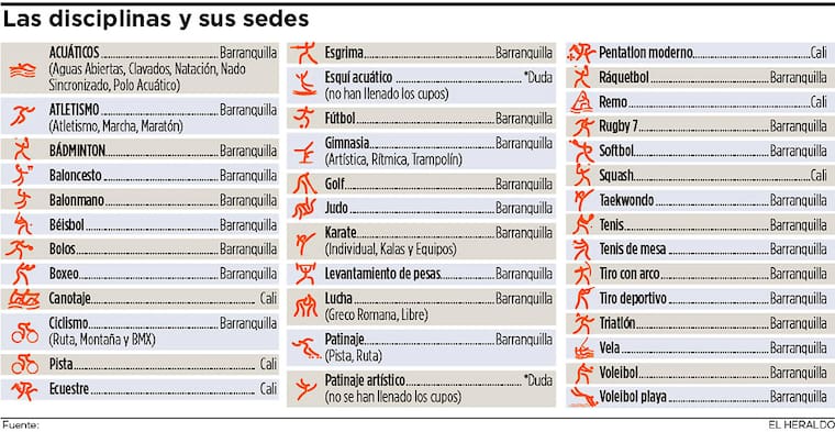 'Bolos, canotaje, ciclismo de pista, ecuestre, pentatlón moderno, remo y squash son las disciplinas que, por ahora, albergará Cali como subsede de los Juegos Centroamericanos y del Caribe', manifestó Armando Segovia, director técnico de las justas, en diálogo con EL HERALDO.