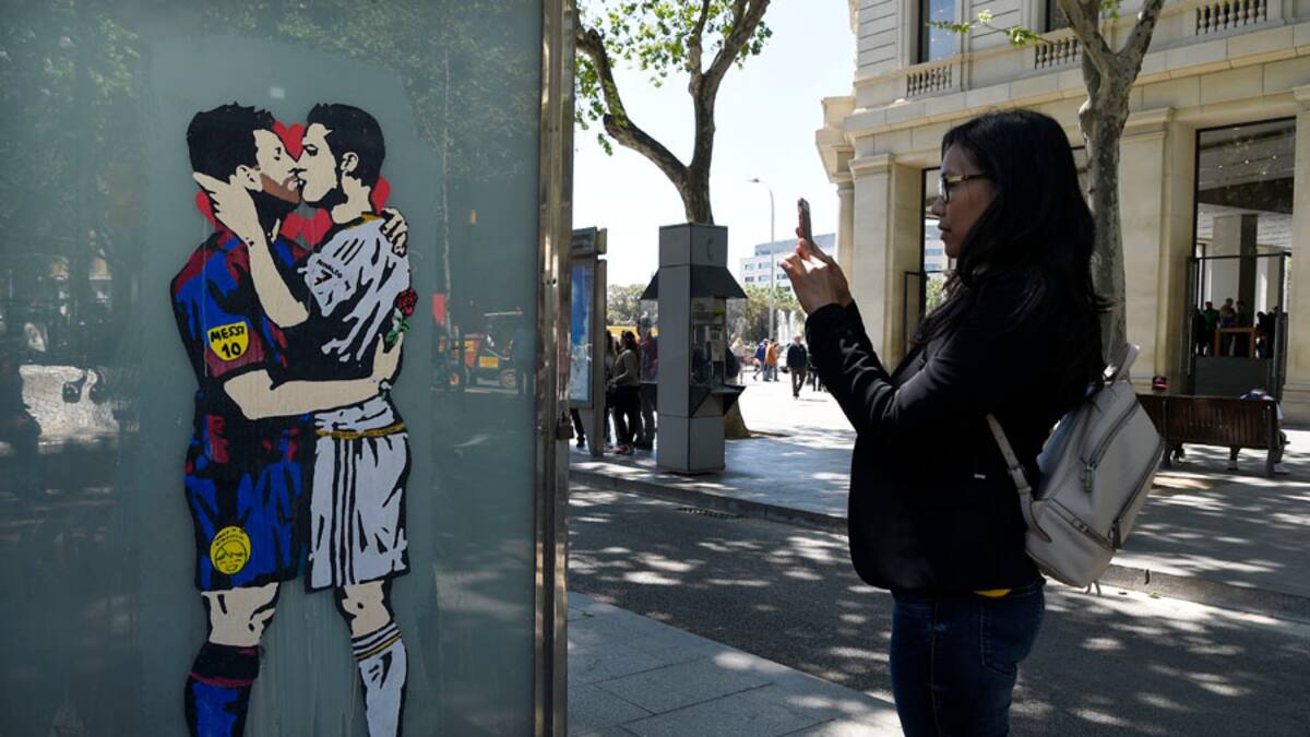 Un grafiti del argentino Lionel Messi de puntillas besando al portugués Cristiano Ronaldo está causando sensación en Barcelona a dos días de que FC Barcelona y Real Madrid se enfrenten en un partido crucial para la Liga española.