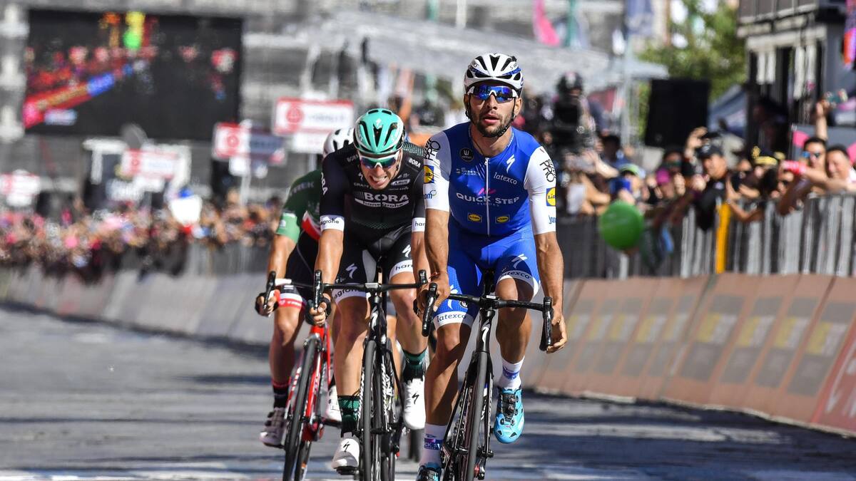 A la tercera fue la vencida y levantó los brazos rematando un enorme trabajo del Quick Step, encargado de provocar un abanico a 10 kilómetros de meta que destrozó el pelotón y anuló a Greipel, quien no pudo retener la 'maglia' rosa, ahora en la ancha espalda del ciclista de La Ceja.