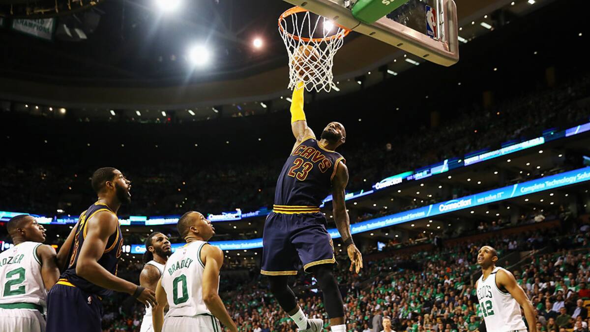 LeBron James anotó 35 puntos para sobrepasar a Michael Jordan como el máximo anotador en los playoffs, y guió a Cleveland a una victoria de 135-102 sobre Boston para avanzar a la tercera final NBA consecutiva contra Golden State.