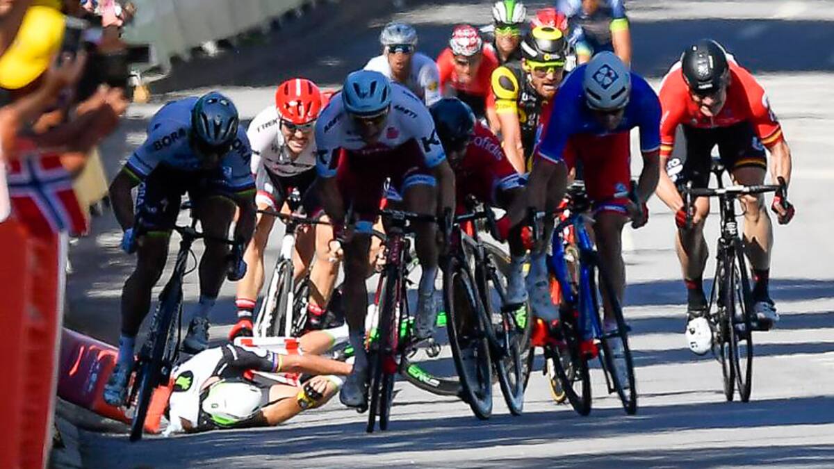 Cavendish seguía la rueda del francés Arnaud Demare, que acabaría ganando la etapa, cuando el campeón del mundo soltó su codo derecho, haciendo caer al británico contra la barrera, a cien metros para la meta.