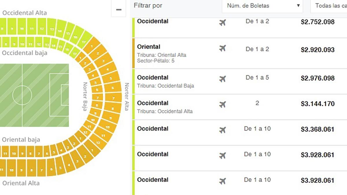 En www.stubhub.co, sitio especializado en la compra y venta de boletas, los tiquetes de las graderías de sur y norte, que tienen un costo oficial de 60 mil pesos, se están ofreciendo a $600 y $800 mil pesos; las de oriental, que valen $200 mil, se cotizan hasta en 2 millones 900 mil pesos; y las de occidental, cuyo precio original es $350 mil, se elevan hasta en $3 millones 900 mil.
