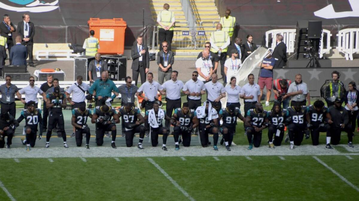 La primera protesta tuvo lugar en el juego de la NFL en Londres entre los Jacksonville Jaguars y Baltimore Ravens en el estadio de Wembley, cuando cerca de una docena de jugadores de ambos equipos se arrodillaron durante el himno mientras que otros permanecieron de pie con los brazos entrelazados.