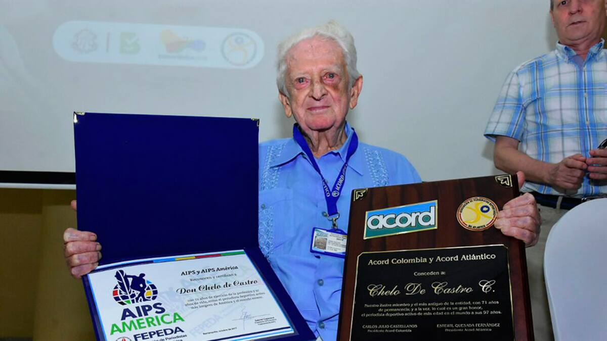 Abrumado y emocionado se mostró Chelo De Castro Carroll durante el reconocimiento que la Asociación Internacional de Prensa Deportiva (AIPS) le entregó como el periodista deportivo más veterano del mundo, este miércoles en Combarranquilla Boston, durante un evento organizado por la Alcaldía en el marco del mes del cronista deportivo.