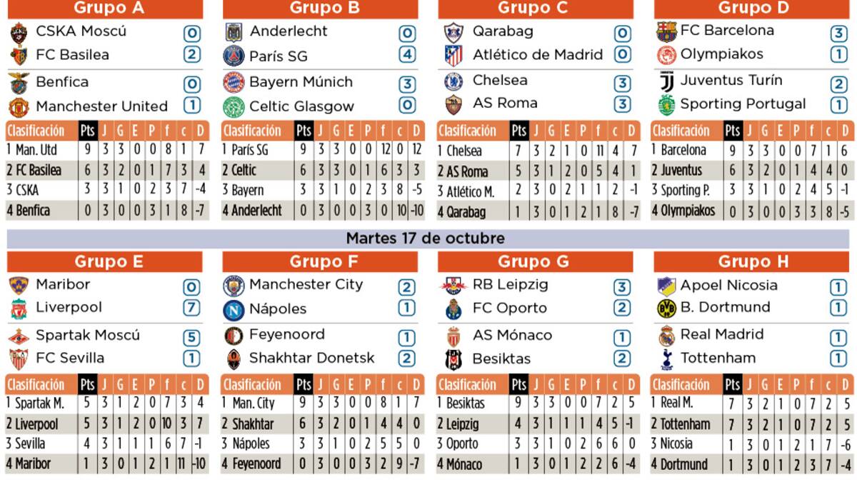 El Chelsea está en cabeza ahora con 7 puntos, mientras que la Roma es segunda con 5. Tercero es el Atlético (2), que decepcionó con un preocupante empate 0-0 en campo del Qarabag.