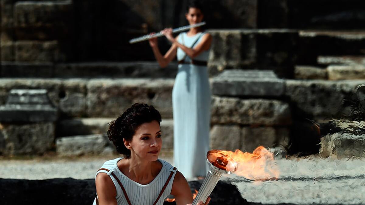 Será la actriz griega Katerina Lehou la encargada de prender la antorcha, vestida con el traje tradicional de las sacerdotisas de la antigüedad, antes de entregársela al primer relevista, el esquiador de fondo y biatleta griego de 24 años, Apostolos Angelis.