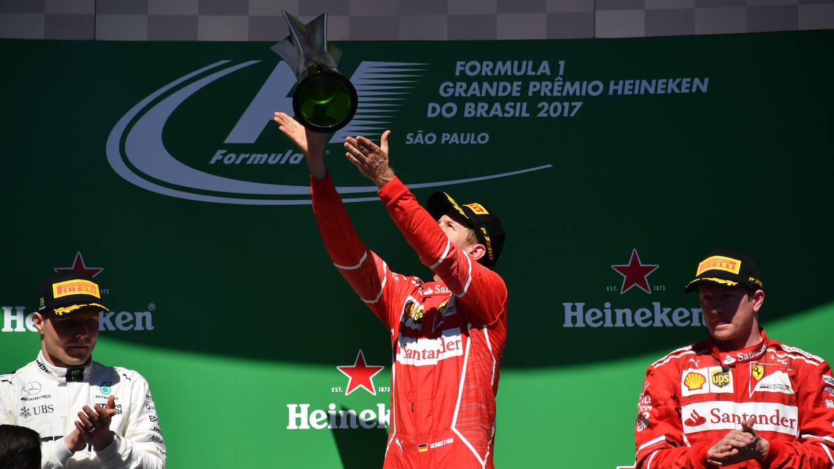 El alemán Sebastian Vettel (Ferrari) ganó este domingo el Gran Premio de Brasil de Fórmula 1 en el circuito de Interlagos, con el tetracampeón Lewis Hamilton (Mercedes) remontando desde la última hasta la cuarta plaza.