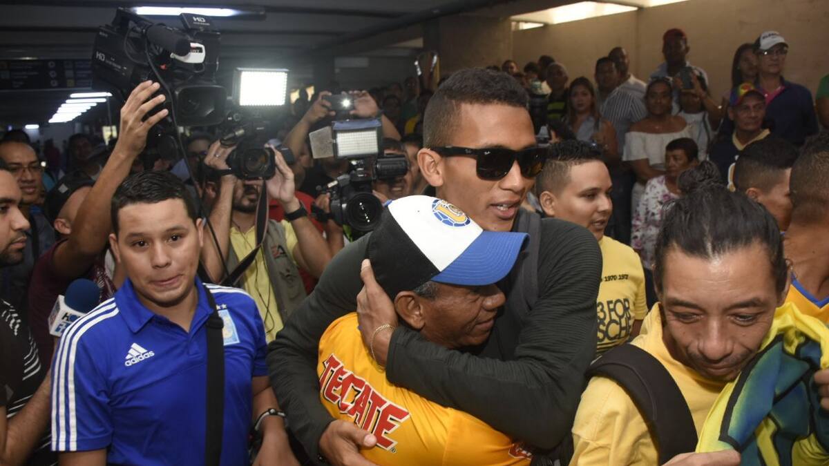 A las 1:45 p.m. salió por la puerta de vuelos internacionales el defensor colombiano, que se mostró sorprendido por la bienvenida y de inmediato se fundió en un fuerte abrazo con sus familiares.