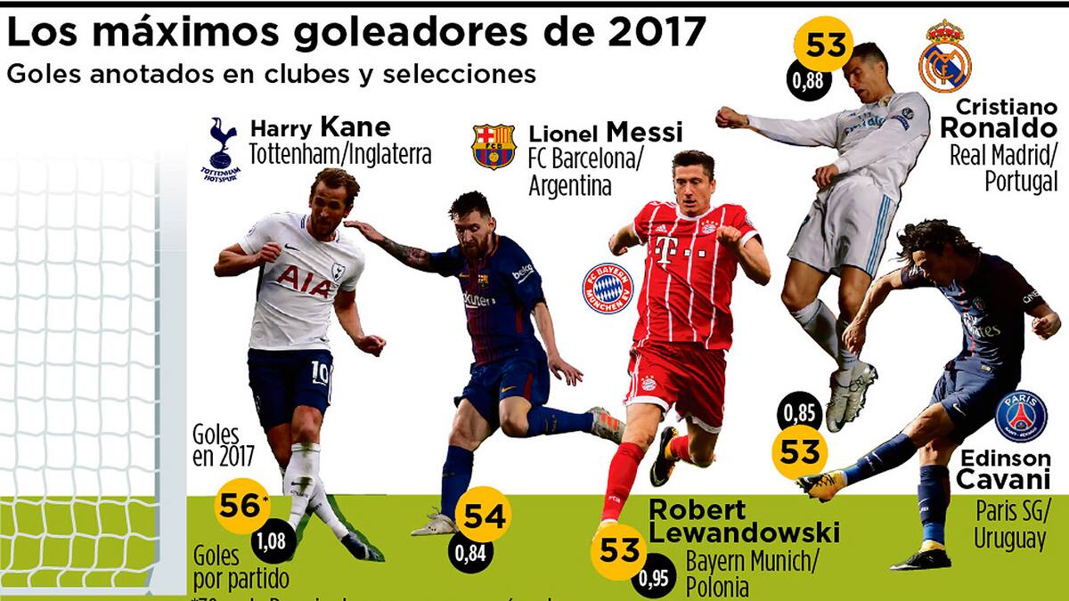 Otras tres estrellas acaban el año con 53 goles: Cristiano Ronaldo (Real Madrid y Portugal), Robert Lewandowski (Bayern de Múnich y Polonia) y Edinson Cavani (París Saint-Germain y Uruguay).