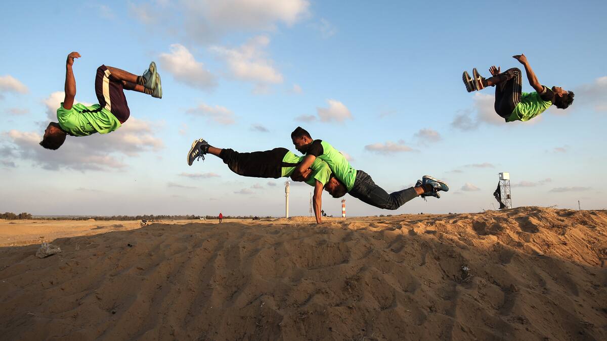 Jóvenes palestinos adeptos al parkour decidieron de forma excepcional efectuar sus acrobacias en la frontera entre la Franja de Gaza e Israel, escenario de importantes manifestaciones y sangrientos enfrentamientos desde fines de marzo.