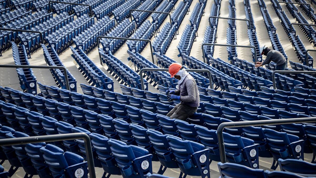 Hombres trabajan en los últimos detalles para que los asistentes disfruten con plenitud del gran evento inaugural que comenzará a las 6 de la tarde, y en el que Colombia y Venezuela jugarán el primer partido oficial en el nuevo estadio, que abrirá sus puertas desde las 4 p.m. Realizado con Samsung GEAR 360.