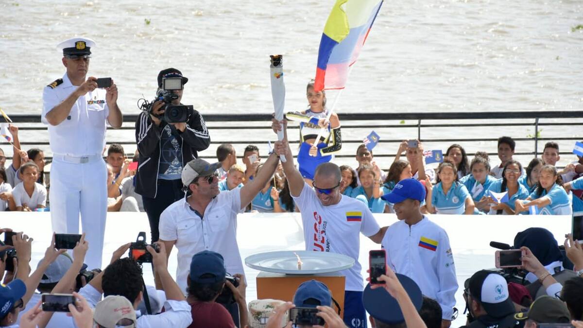 Entre aplausos, gritos y la canción oficial de los Juegos de fondo, el buque se acercaba a la zona. Ubicado frente a la tarima, al buque se le acercó una pequeña embarcación para recoger al sargento segundo Carlos Salamanca, el deportista paralímpico que traía la antorcha desde Cartagena de Indias.