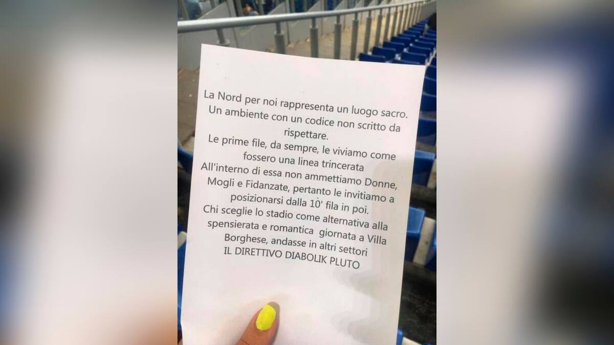 El texto, distribuido este sábado durante el partido de la 1ª jornada del Campeonato de Italia, pedía a las mujeres que no ocuparan las diez primeras filas de la tribuna Norte del estadio Olímpico de Roma, la de los Ultras del Lazio.