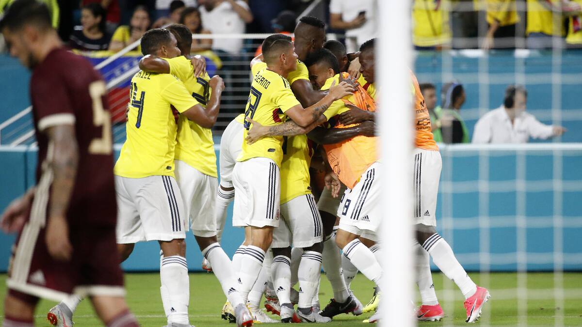 Colombia no sintió este viernes las ausencias de su estrella James Rodríguez ni del argentino José Pekerman, el técnico que la posesionó nuevamente en el primer plano del fútbol internacional. La Amarilla venció 2-1 a Venezuela en un amistoso disputado en el Hard Rock Stadium de Miami.