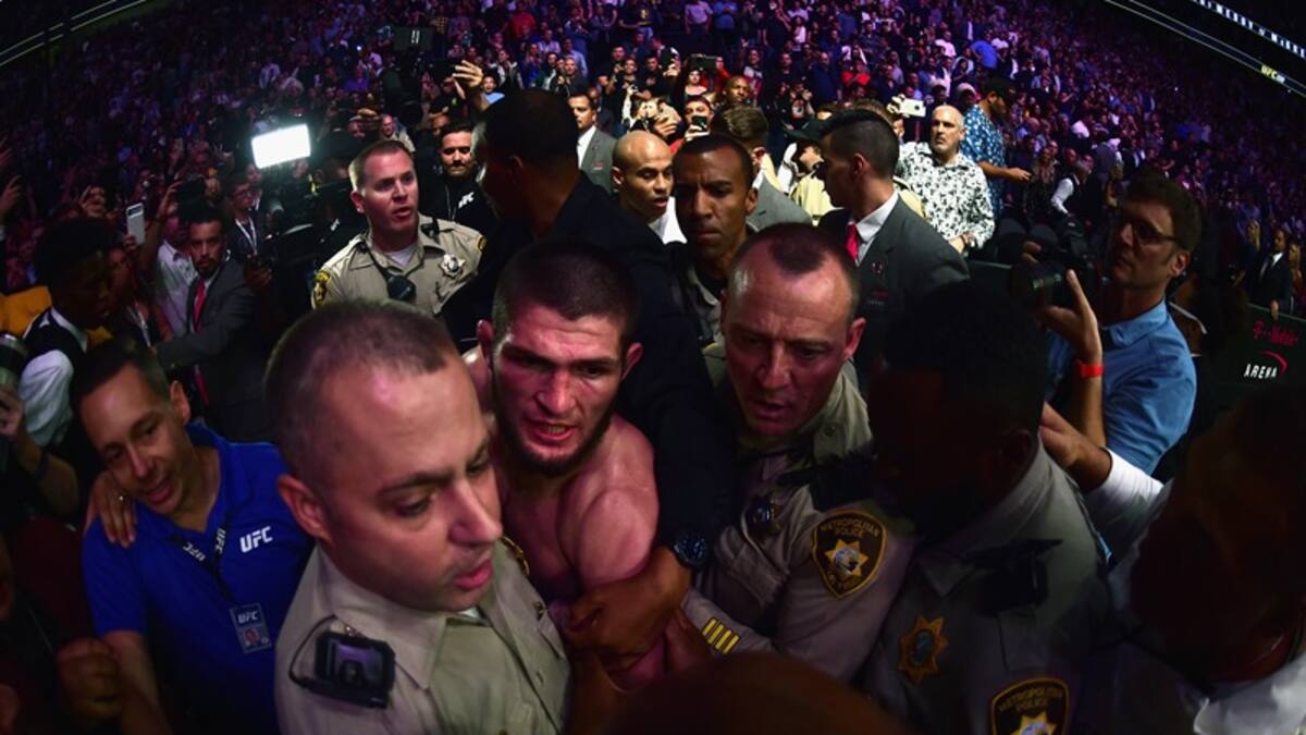 Tras la rendición de McGregor, Nurmagomedov se lanzó por encima del octágono al rincón de su oponente, aparentemente para pegar al entrenador de su rival, Dillon Danis, lo que dio paso a una pelea multitudinaria en la que incluso varios miembros del público subieron al cuadrilátero a golpear al irlandés mientras este se recuperaba, obligando a la policía a actuar.