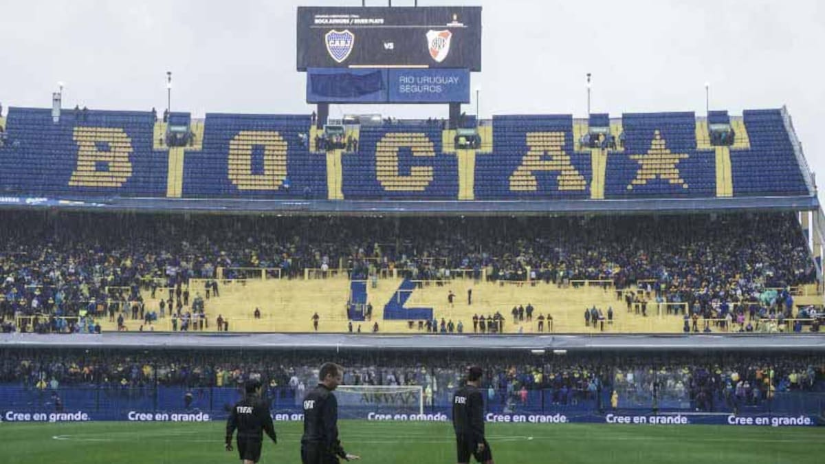 El anuncio al público fue hecho 95 minutos antes de la hora prevista para el encuentro (3 p.m., hora colombiana) por los altoparlantes dela mítica Bombonera, que ya tenía casi sus 53.000 plazas ocupadas y donde la hinchada no cesaba de cantar bajo la tormenta.